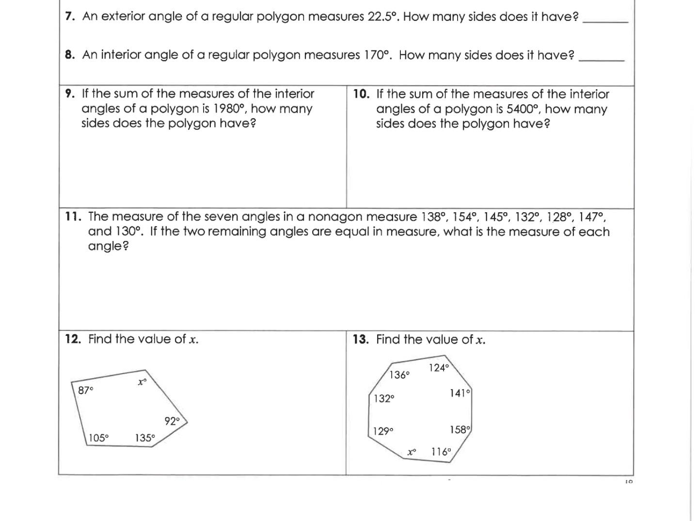 (where n represents the number of sides of the polygon). Problem 4 each interior angle of a regular polygon measures 160°. How many sides does the polygon have ? To generalize our calculation of angle sum, we use the fact that the angle sum of a triangle is degrees. As there are #8# interior angles each #135^o#.